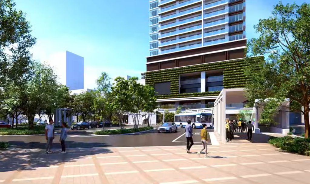 また、低層部の壁面を緑化することで、駅前空間の街路樹と繋がりを感じさせる設計になっており、駅前直結が強調されています。