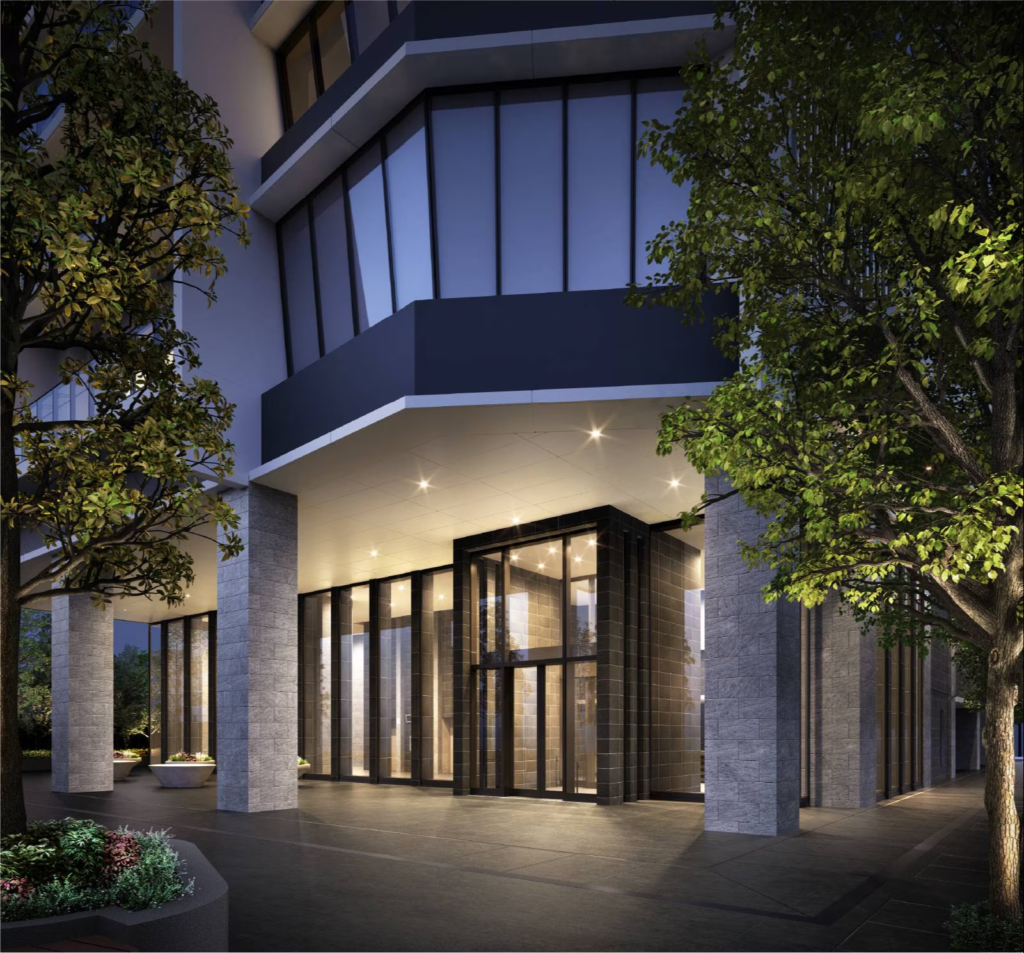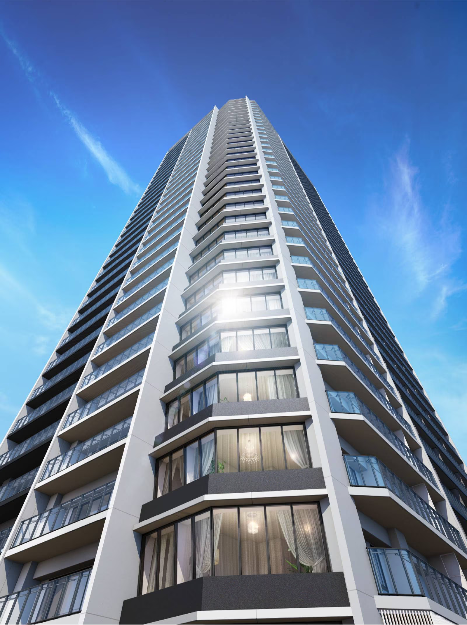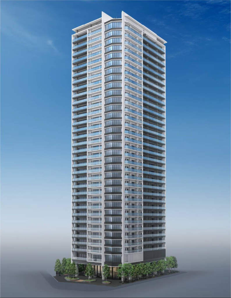 画像で見ると、一般的な板状タワーに比べて、コーナー部分のガラスが強く効いています。これにより、真正面から見たときは垂直性が強く、斜めから見たときは光を受ける面が増えて、塔身の表情が変わる構成です。