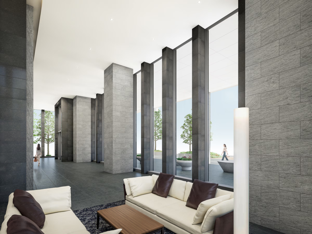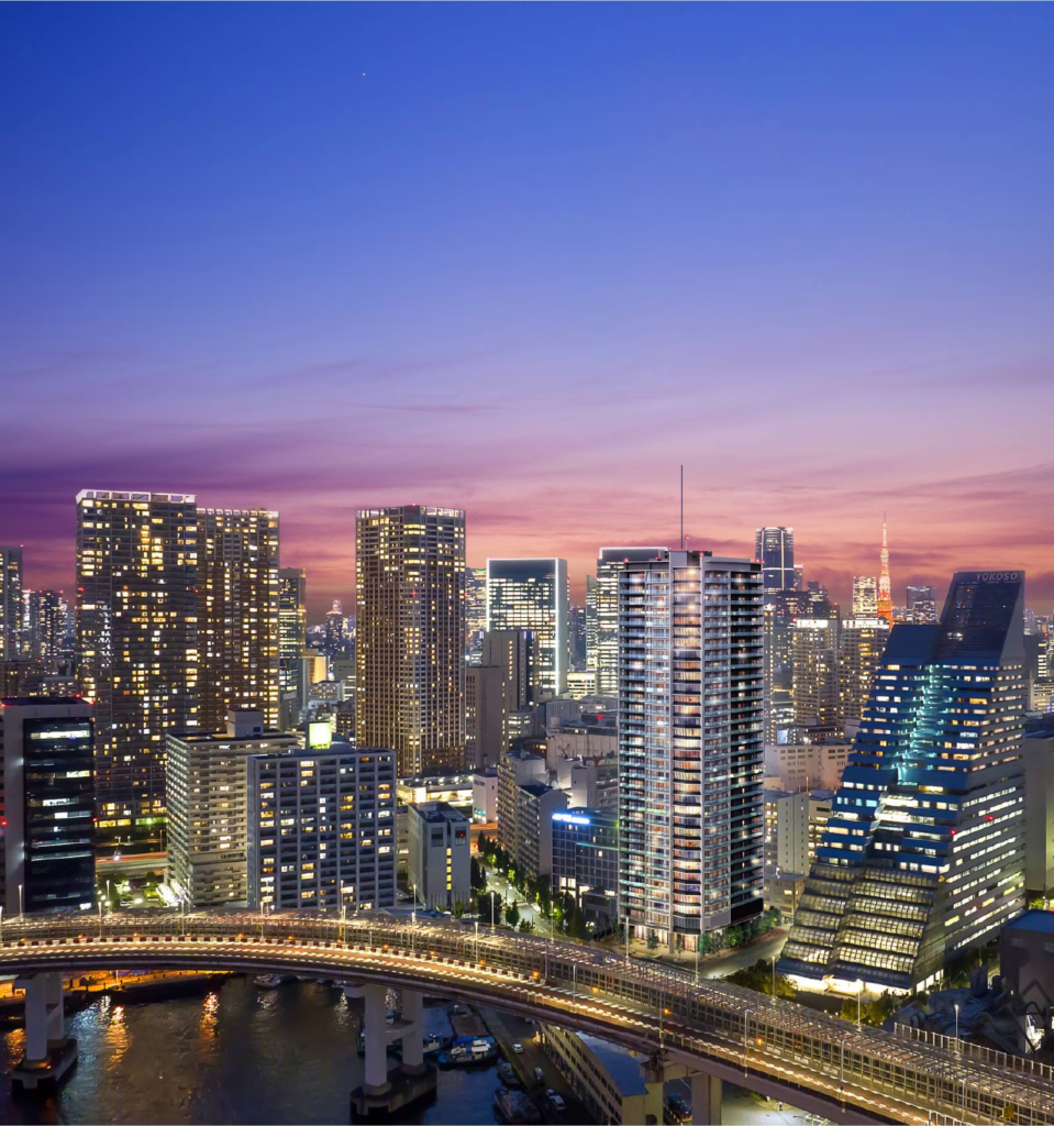 画像からもその意図は読み取れます。外観CGでは、運河沿いの比較的開けた場所に、垂直ラインの強い細身の塔身が立ち、足元には樹木の並ぶ広場が描かれています。これは「巨大街区の主役」ではなく、周辺の空・水・橋梁スケールに対して、一本のランドマークとして立つ設計です。大崎や豊洲のような超大規模街区型とは、都市への出方が違います。