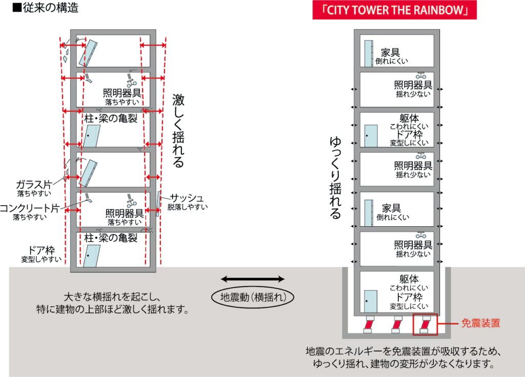 本件は免震タワーレジデンスとして公式に打ち出されています。免震は、超高層でありがちな「大地震時の大きな揺れ」だけでなく、居住者にとっては家具転倒や室内の被害を抑えやすいことが価値になります。特に水辺に近く、風の抜けやすい立地では、高層階の揺れ体感は購入判断に直結しやすく、免震の意味は大きいです。