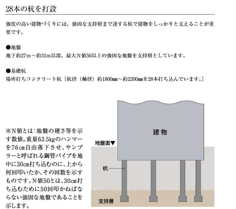 そして水辺で不安要素になる地盤の弱さに対しても対策が明確に示されています。強固な支持層に届くように杭を打ち込むことで建物自体の強さが確保されています。