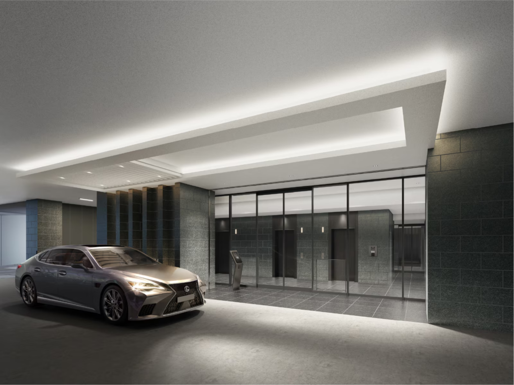 建物全体に効く設備としては、スカイラウンジ、テレワークラウンジ、フィットネスルーム、ゲストルーム(オーナーズスイート)、内廊下設計が明示されています。さらに地下にはコーチエントランスがあり、天候に左右されずに乗降できる設計です。