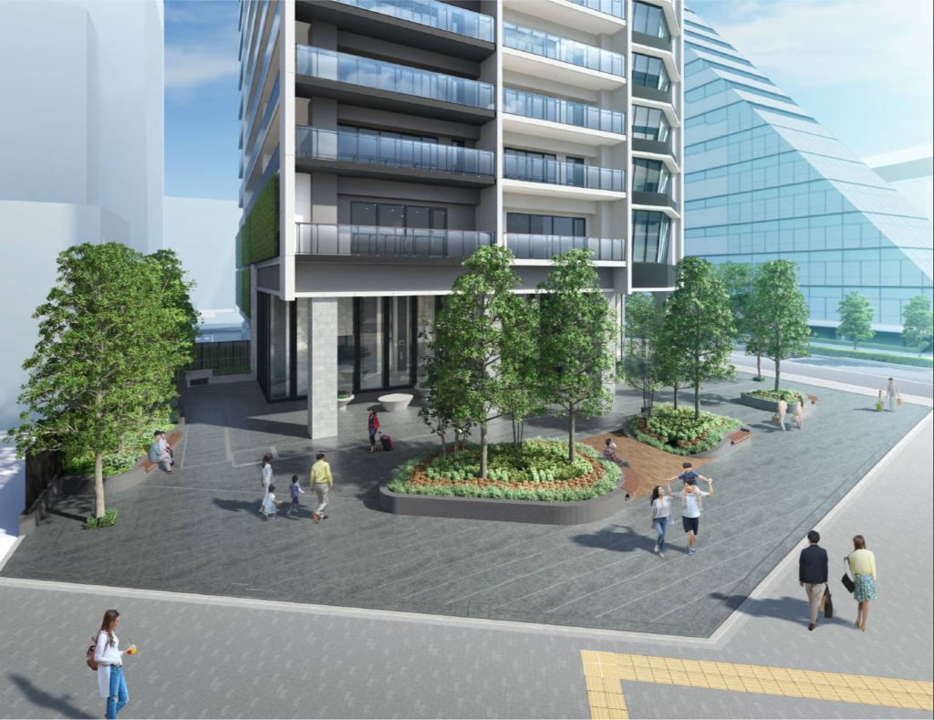 本件の外構は非常に重要です。SUUMOでは、足元に約1360㎡の公開空地(広場状空地・歩道状空地)を設け、「街と人と緑をつなぐ」ランドプランを実現すると説明されています。芝浦・海岸エリアは、道路・倉庫・運河・高架・業務機能が混ざるため、建物足元の外構が弱いと、一気に“住む場所”に見えなくなります。