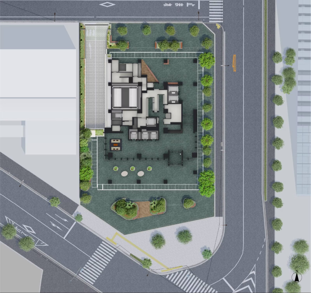 画像からも、街路沿いに樹木が連続し、低層部がピロティ状に抜けているのが分かります。これは二つの効果があります。ひとつは、周辺の人工的な景観に対して足元だけでも緑の層を作り、住宅としての心理的な柔らかさを出すこと。もうひとつは、ピロティと奥行きのあるアプローチで、通りから建物内部への気分の切替装置を作ることです。駅近ではないぶん、建物に着いた瞬間の体験を重くしているわけです。