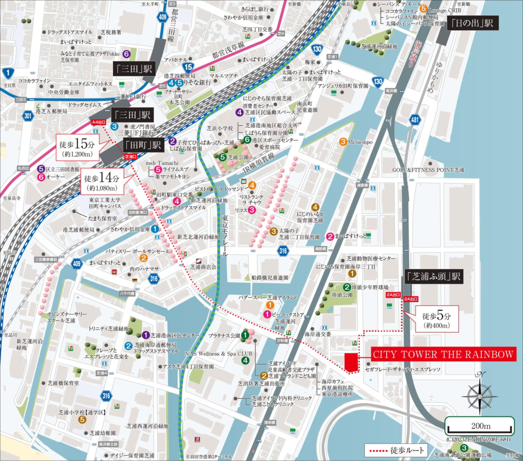 立地の特徴は、「田町徒歩圏だが、駅前ではなく海岸三丁目」という点です。これは長所と短所が明確です。短所はもちろん駅距離で、田町駅徒歩14分は山手線徒歩圏としては強くありません。一方で長所は、水辺、公園、運河、レインボーブリッジ眺望、芝浦再開発街区の近接を享受できることです。つまり、駅近都心ではなく、都心近接のシーサイド居住として評価するべき場所です。