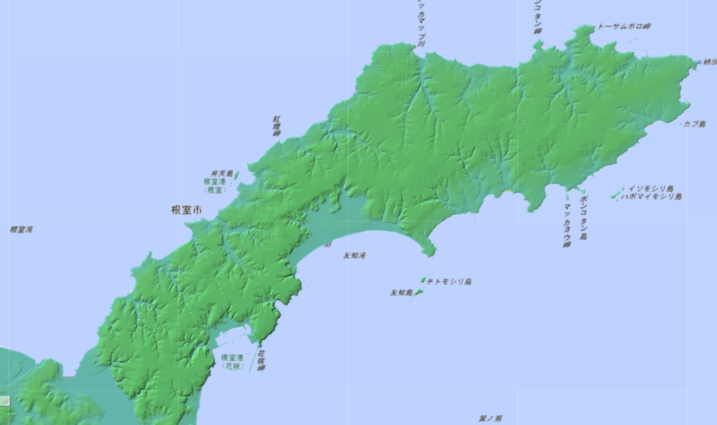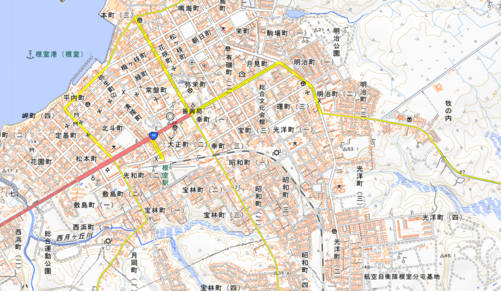 根室市は半島状の地形で、市街地は港周辺に広がりながらも低密度に分散しています。