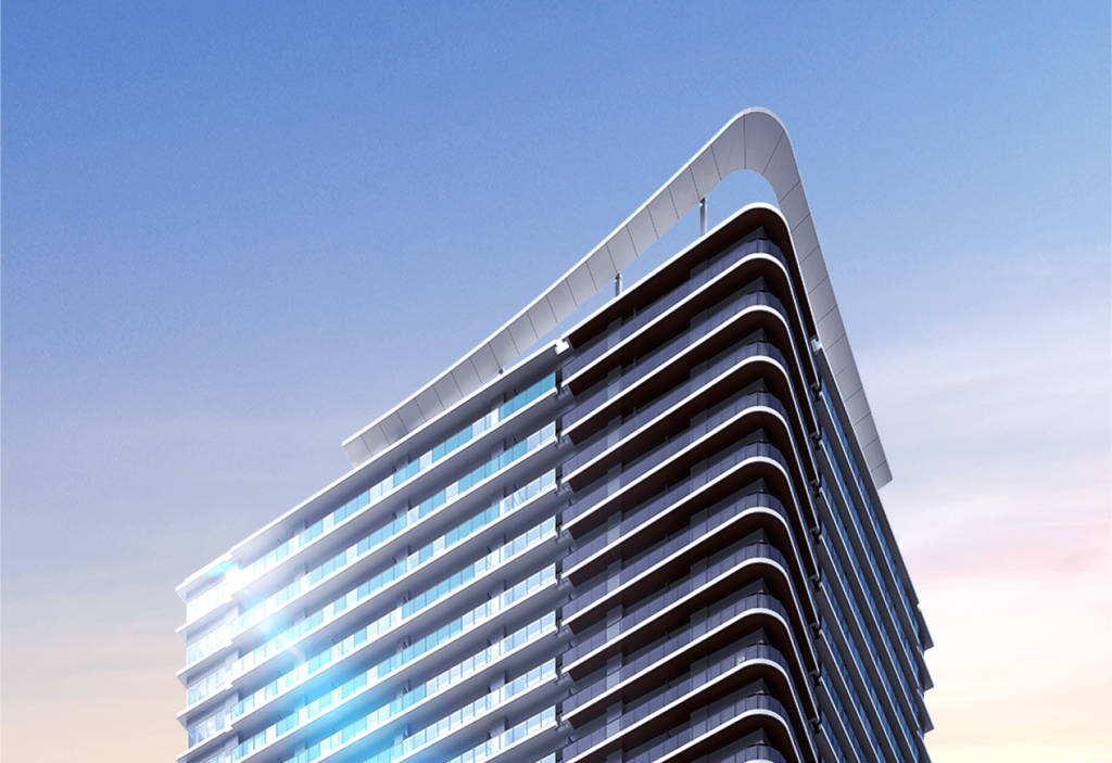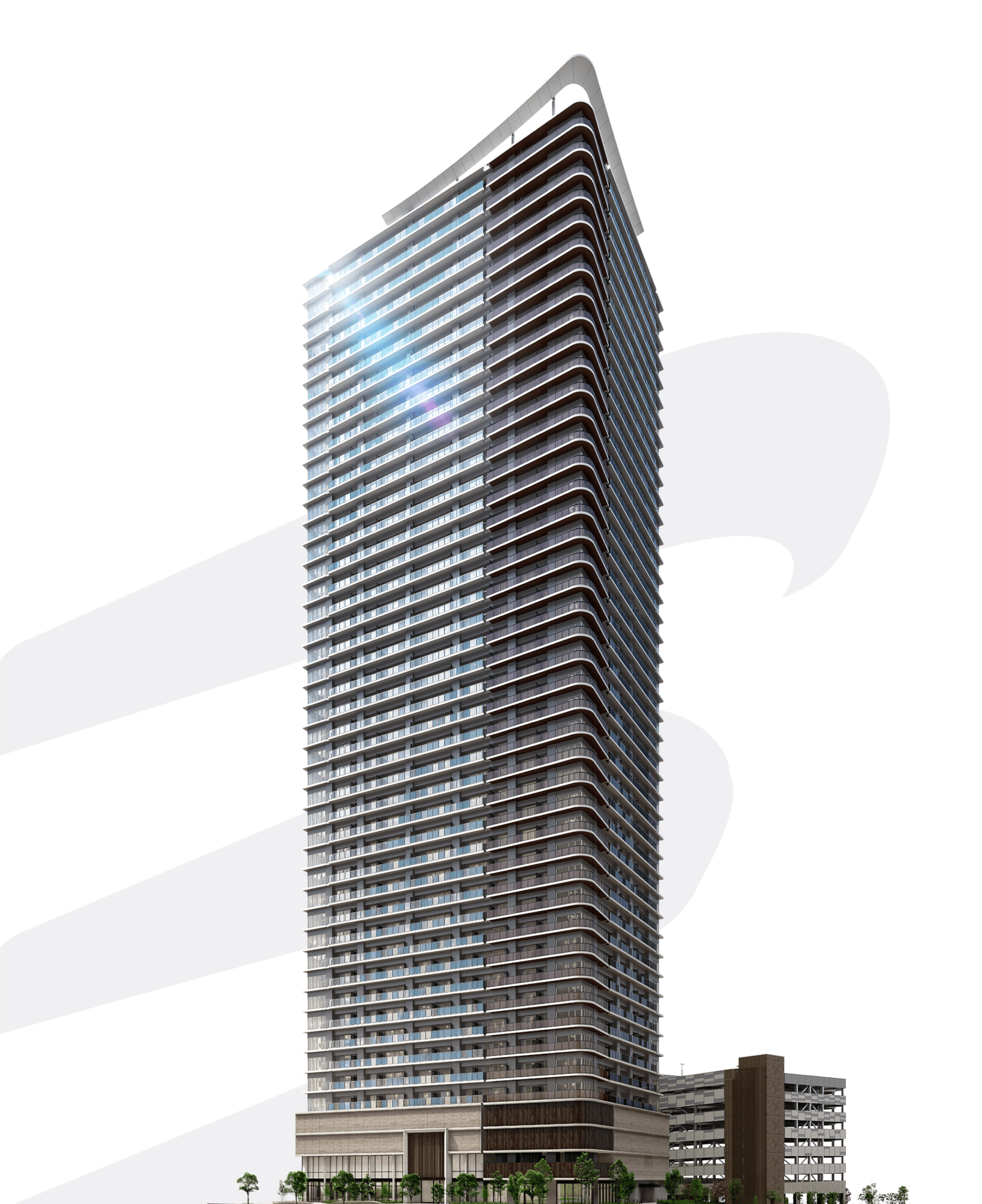 高層部は「頂」がテーマになっており、未来へ向かう飛び立つイメージとしてガラスの手すりのグラデーションからフィンへと繋がります。